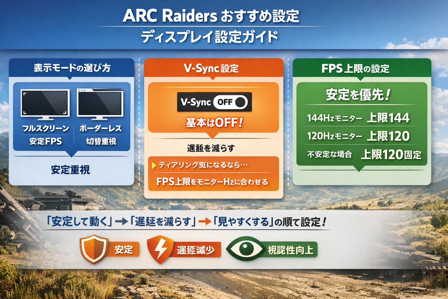 👉ARC Raiders おすすめ設定:ディスプレイ設定(フルスクリーン・V-Sync・FPS上限)