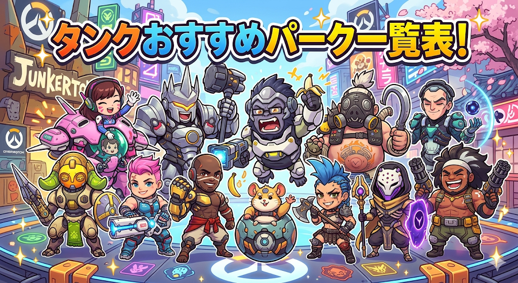 この記事は、タンクを触り始めた人から中級手前くらいの人に向けて、全タンクの基本形・安定寄り・火力寄りを日本語版パーク名で統一したうえで、「どんな時に切り替えるか」まで実戦目線で整理しています。