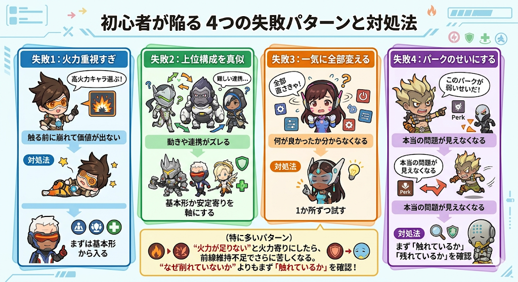 特に多いのは、「火力が足りない」と思って火力寄りにしたら、実は前線維持不足でさらに苦しくなるパターンです。「なぜ削れていないか」よりも「そもそも触れているか」を先に確認してください。
