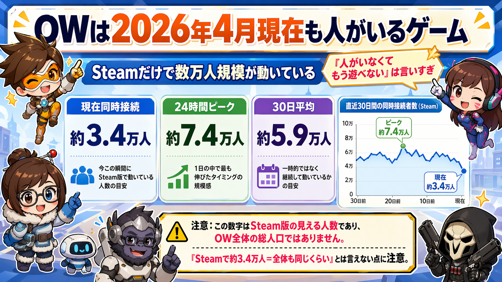 OWは2026年4月現在も人がいます。Steam版では、現在同時接続が約3.4万人、24時間ピークが約7.4万人、30日平均が約5.9万人と確認できます。