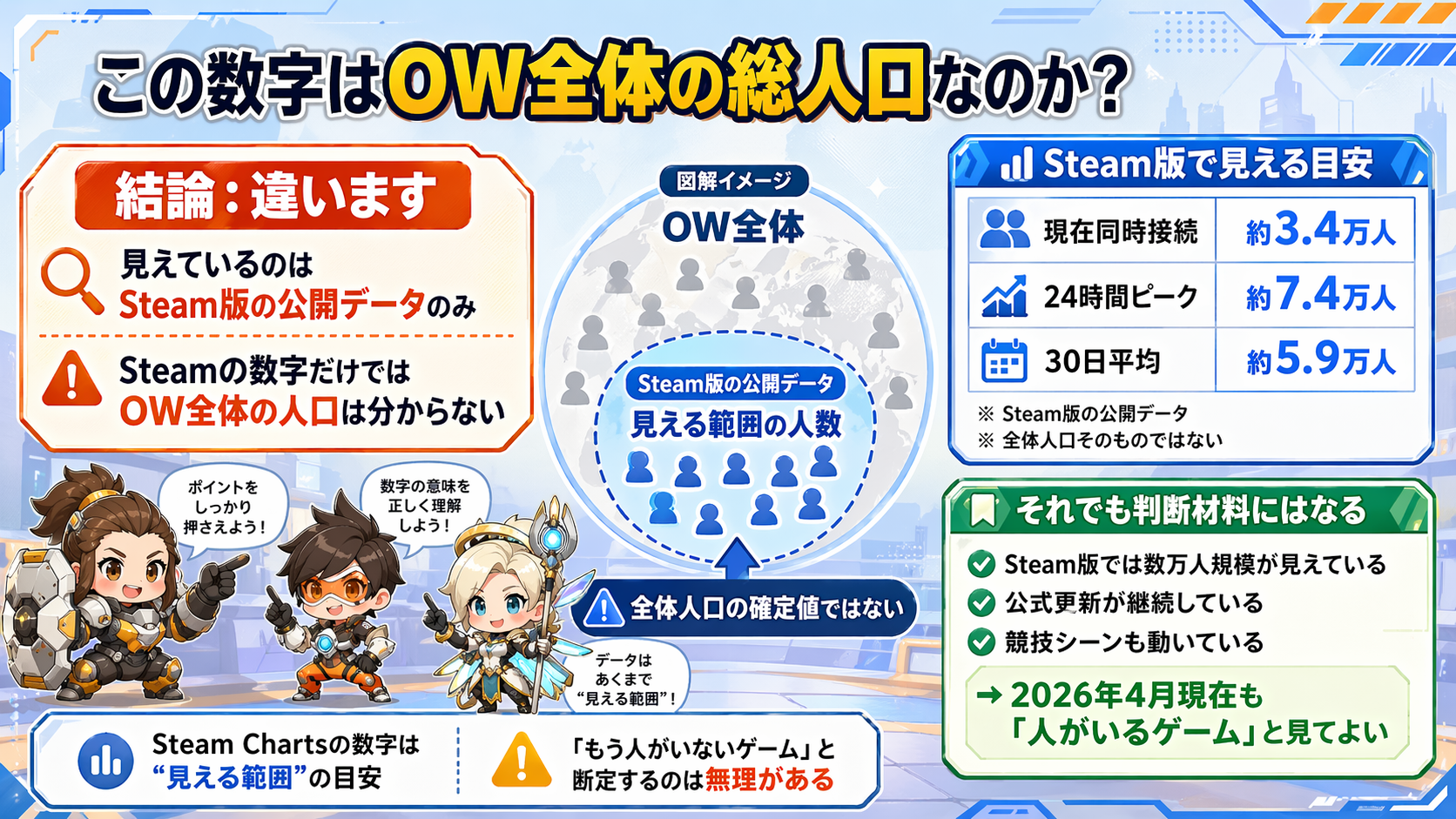 ただしこれはSteam版だけの数字で、OW全体の総人口ではありません。 この記事では、まず今見える人数を整理して、「この数字をどう読めばいいか」だけ短くまとめます。