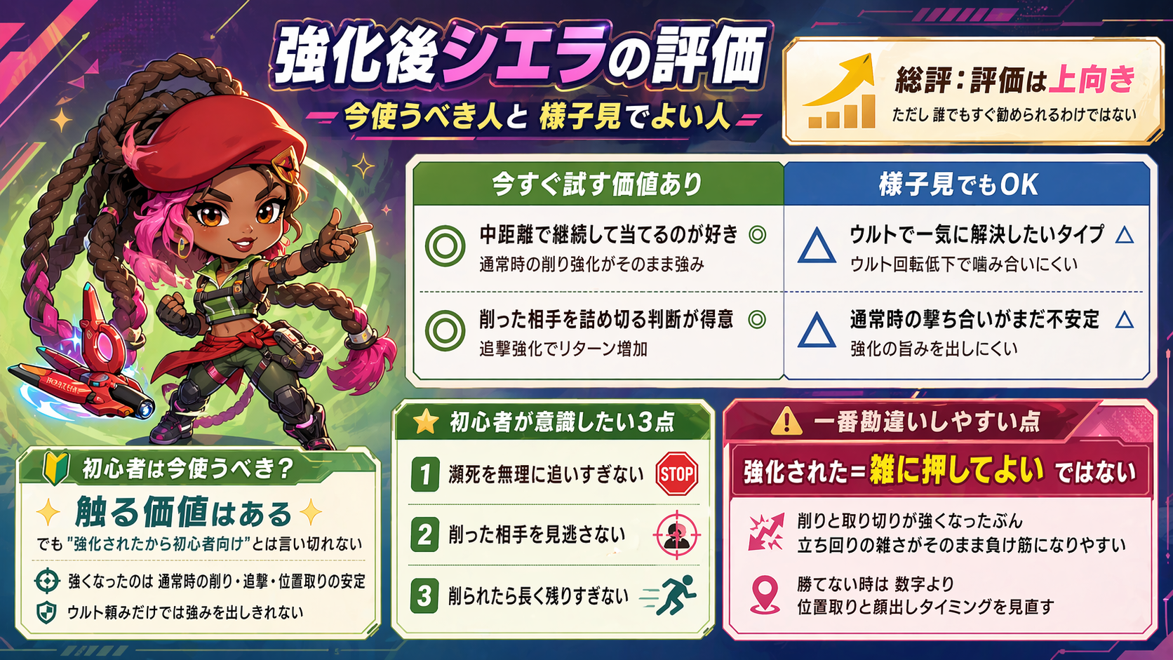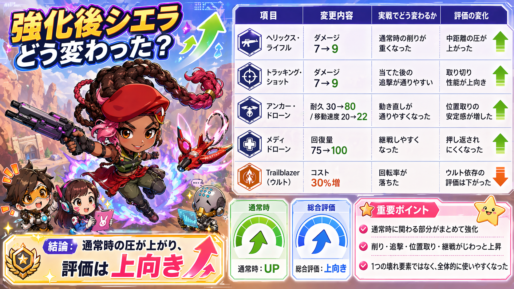 シエラが強化されたと聞いて「で、実際どこが変わったの?」と調べた人が多いと思います。正直、パッチノートの数字だけ見ても「2ダメ増えました」で終わりがちで、試合中に何が変わるのかが分かりにくいんですよね。