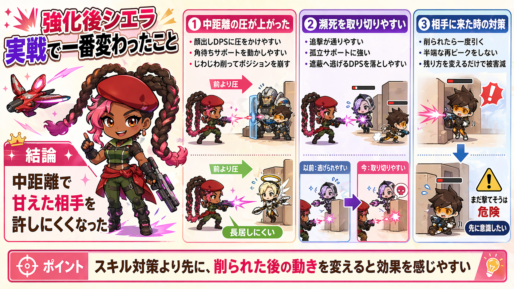 強化後シエラを使うなら、最初に意識したいのはウルトより中距離の削りと取り切りです。相手に来た時は、削られた直後の再ピークを減らすだけで被害がかなり変わります。